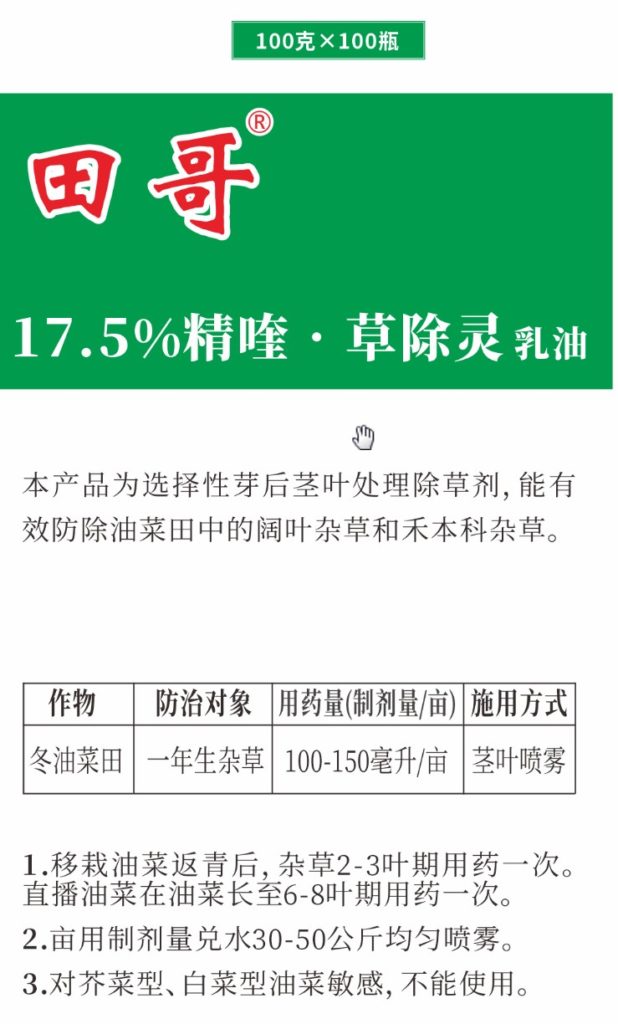 [使用技術(shù)要求]1.移栽油菜返青后,雜草2—3葉期用藥一次。直播油菜在油菜長至6—8葉期用藥一次。2.畝用制劑量兌水30—50公斤均勻噴霧。3.對芥菜型、白菜型油菜敏感,不能使用。4.油菜每個(gè)生長周期最多使用1次。
